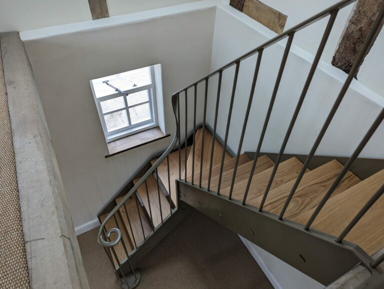 Winthill Engineering designed a sleek and sinuous staircase with powder coated mild steel, solid oaks treads and hand-forged detailing to achieve the Hatton’s brief for a light and airy statement staircase.